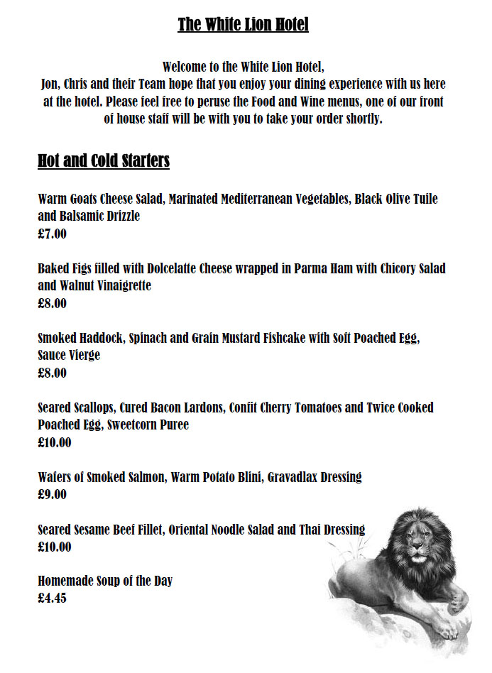 Starters : Main Courses : Sweets : Catch Of The Day : Blackboard Menu : Sunday Lunch Lounge : Courtyard : Book Online : Our Reviews |